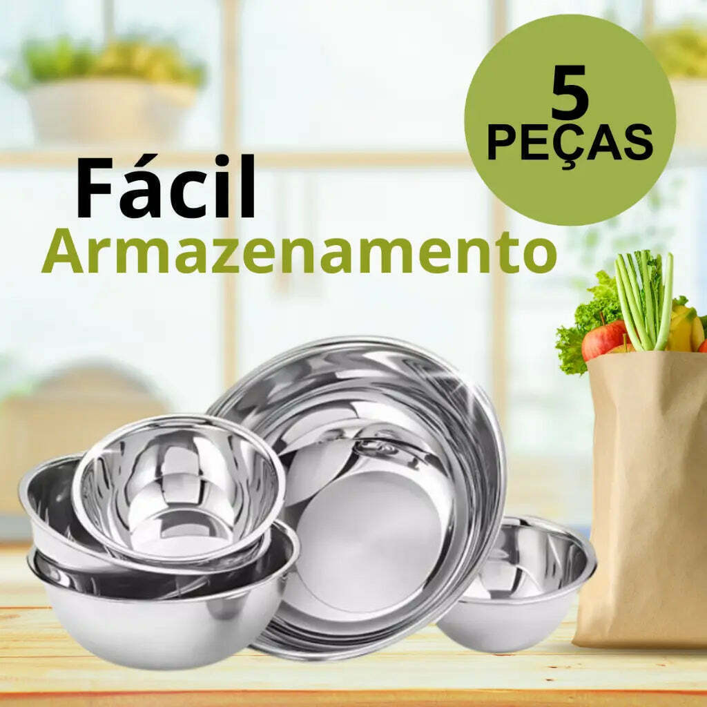 Cada bowl possui um diâmetro, 1 de 27,2 cm e altura de 7,4 cm, 1 de 23,2 cm, 1 de 21,2 cm, 1 de 17,4 cm, 1 de 15,2 cm, com formato redondo que facilita o manuseio e o armazenamento. Feitos em aço inoxidável, são resistentes e garantirão uma durabilidade excepcional, além de serem fáceis de limpar, pois são aptos para lava-louças.