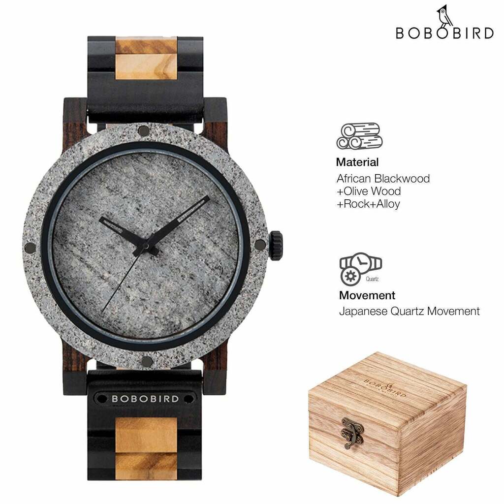 Nosso Relógio de Pedra BOBO BIRD para Homens é a escolha ideal para quem busca um acessório único e sofisticado. Este relógio combina a robustez da pedra com a elegância da madeira, criando um design que é ao mesmo tempo moderno e atemporal.