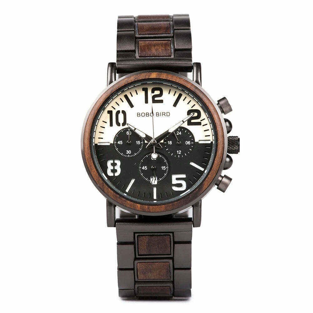 Os Relógios Masculinos de Madeira BOBO BIRD combinam luxo, estilo e funcionalidade, tornando-os um presente ideal para qualquer homem. Estes relógios de marca de topo são não apenas elegantes, mas também práticos, com um design de cronógrafo e estilo militar. Feitos com materiais de alta qualidade, incluindo madeira fina, eles são uma escolha excelente para quem valoriza a sofisticação e a durabilidade. Perfeitos para uso diário ou em ocasiões especiais, estes relógios são um presente maravilhoso e uma adição impressionante a qualquer coleção.
